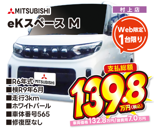 支払総額139.8万円/R6年式/検R9年6月/走行3km/ホワイトパール/村上店