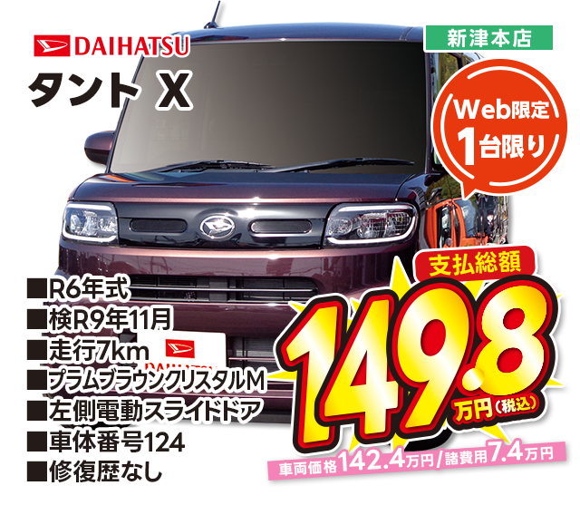 支払総額149.8万円/R6年式/検R9年11月/走行7km/プラムブラウンクリスタルM/左側電動スライドドア/新津本店