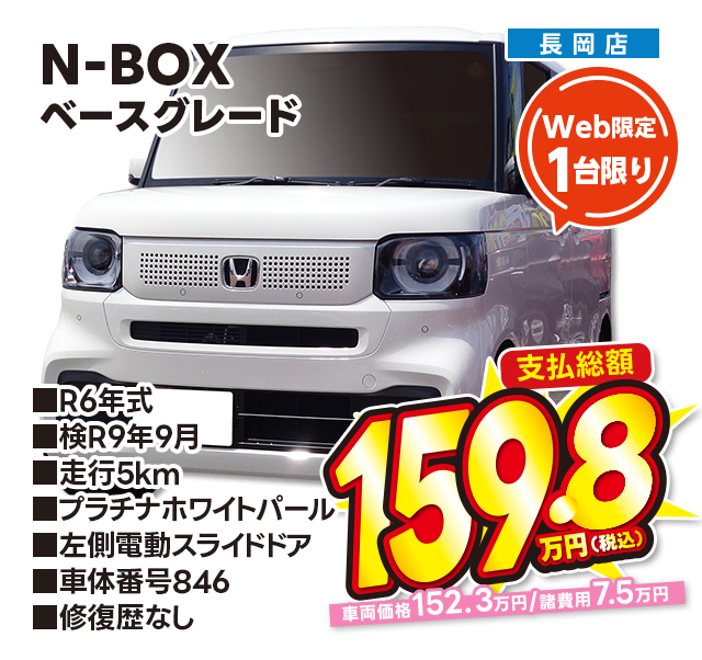 支払総額159.8万円/R6年式/検R9年9月/走行5km/プラチナホワイトパール/左側電動スライドドア/長岡店