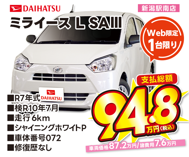 支払総額94.8万円/R7年式/検R10年7月/走行6km/シャイニングホワイトP/新潟駅南店