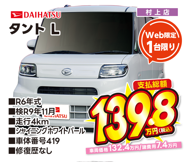 支払総額139.8万円/R6年式/検R9年11月/走行4km/シャイニングホワイトパール/村上店